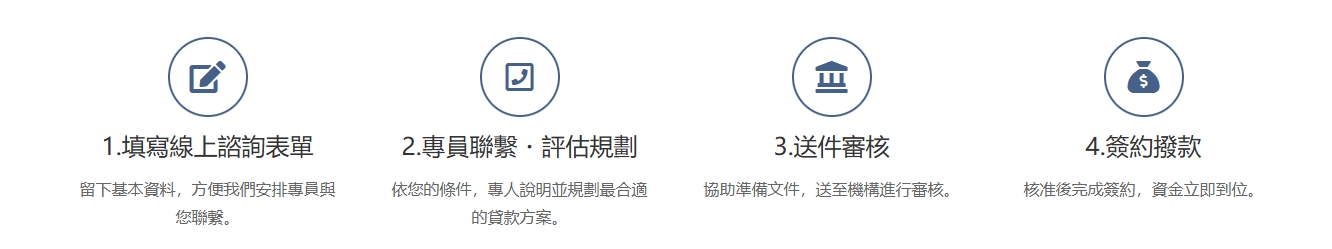 - 方案規劃:依個人條件核定額度與利率,專員協助爭取最佳方案